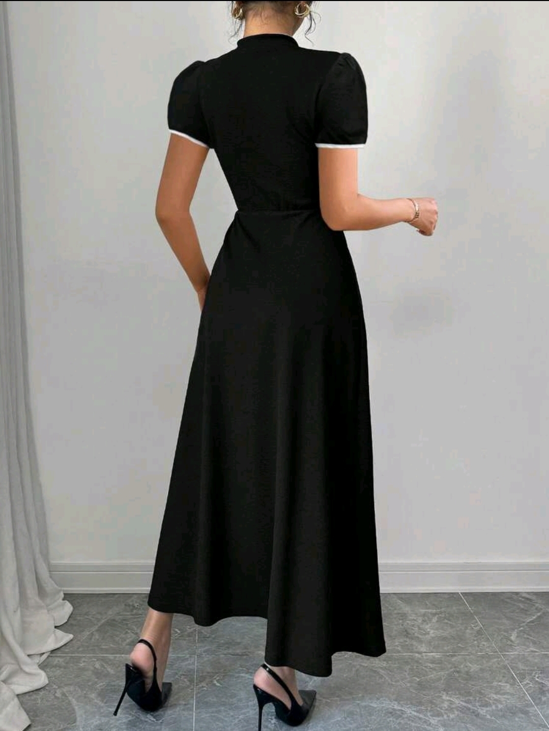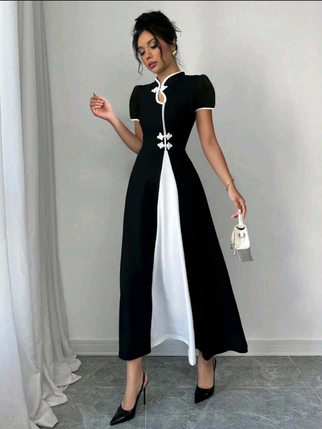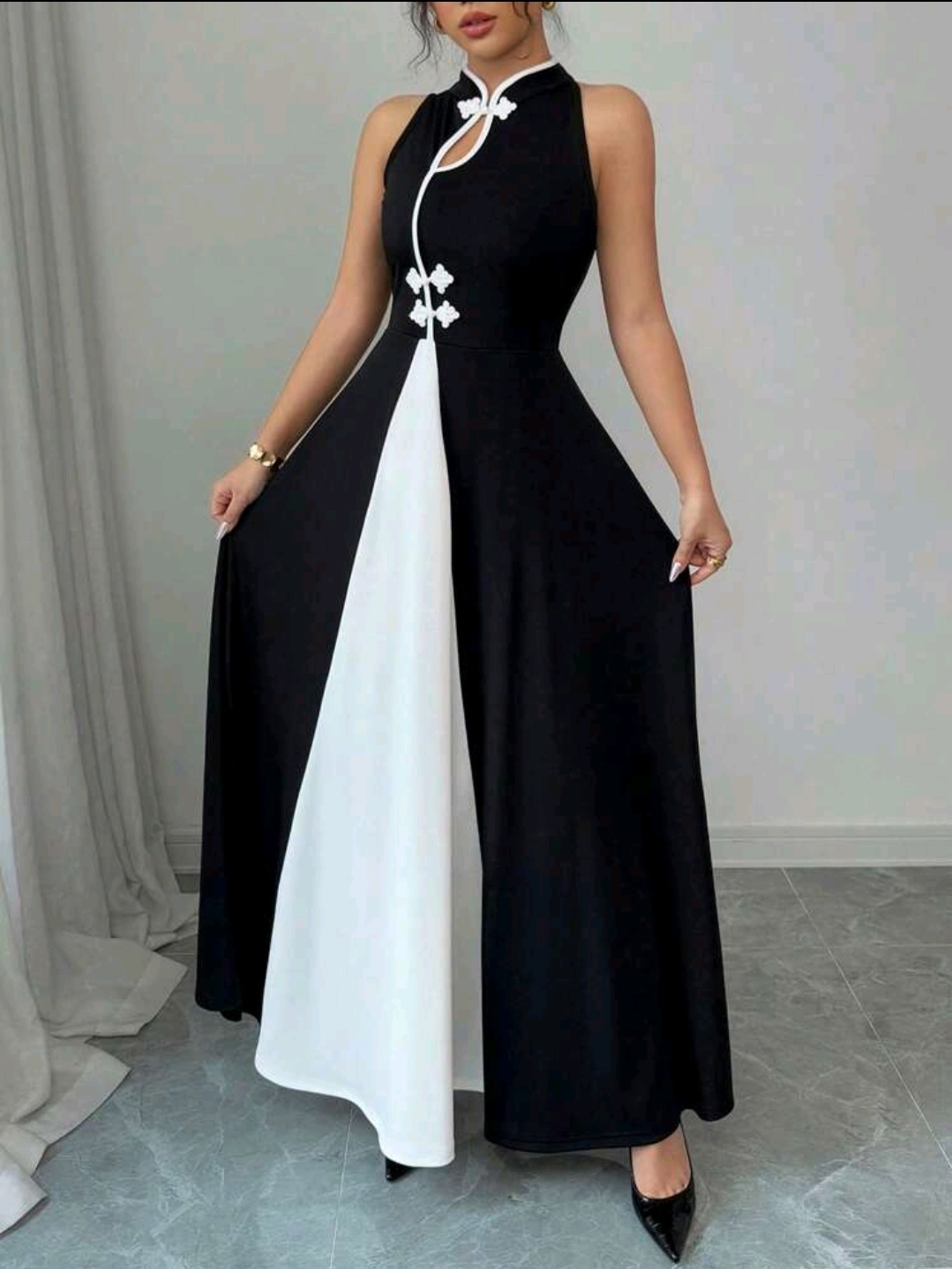 فستان ماكسي أنيق أسود اللون بدون أكمام وبأزرار مجوفة وفتحة عالية بألوان متعددة للنساء، ربيع/صيف
