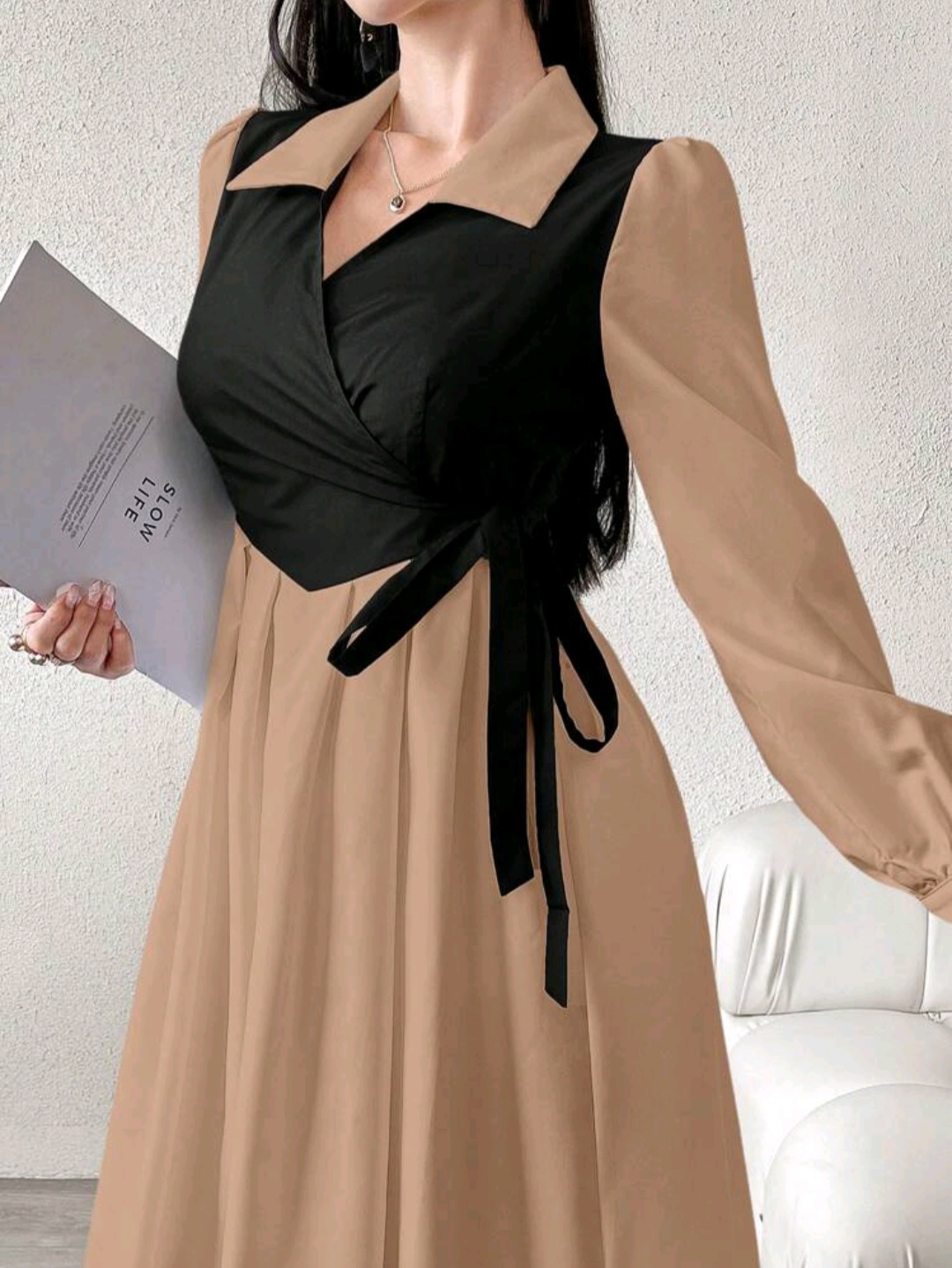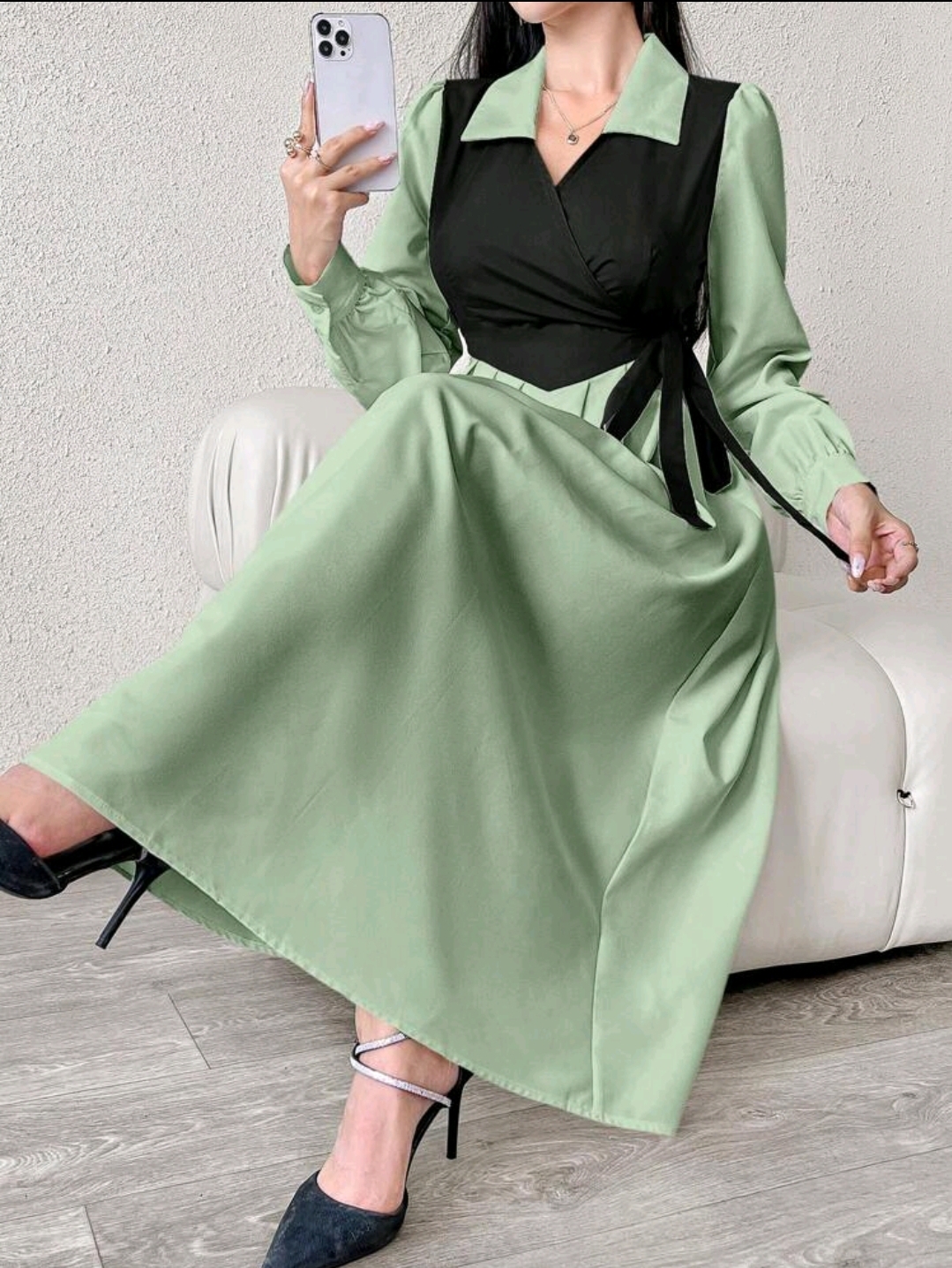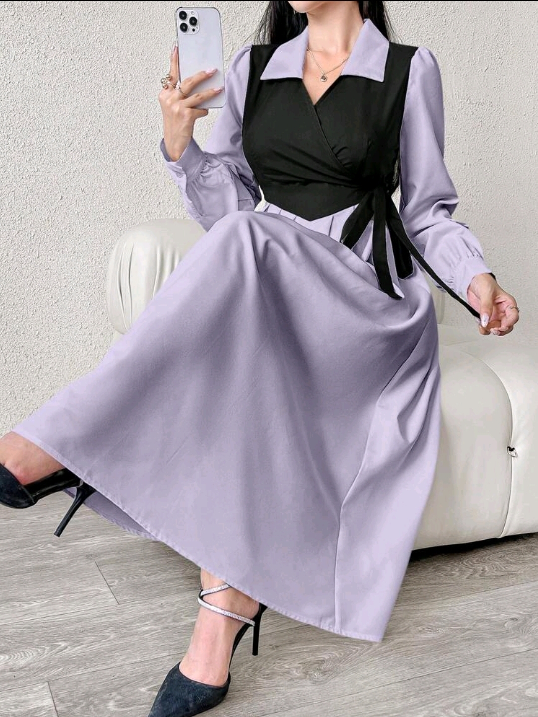 فستان ماكسي كاجوال بأكمام منتفخة وعقدة جانبية بألوان مختلفة