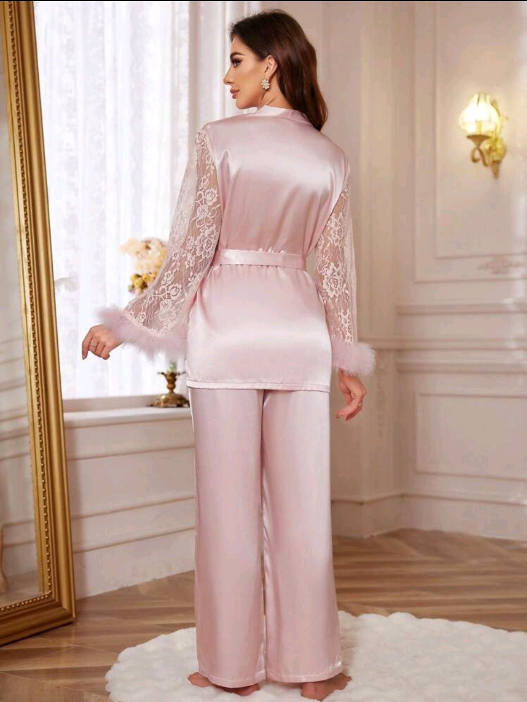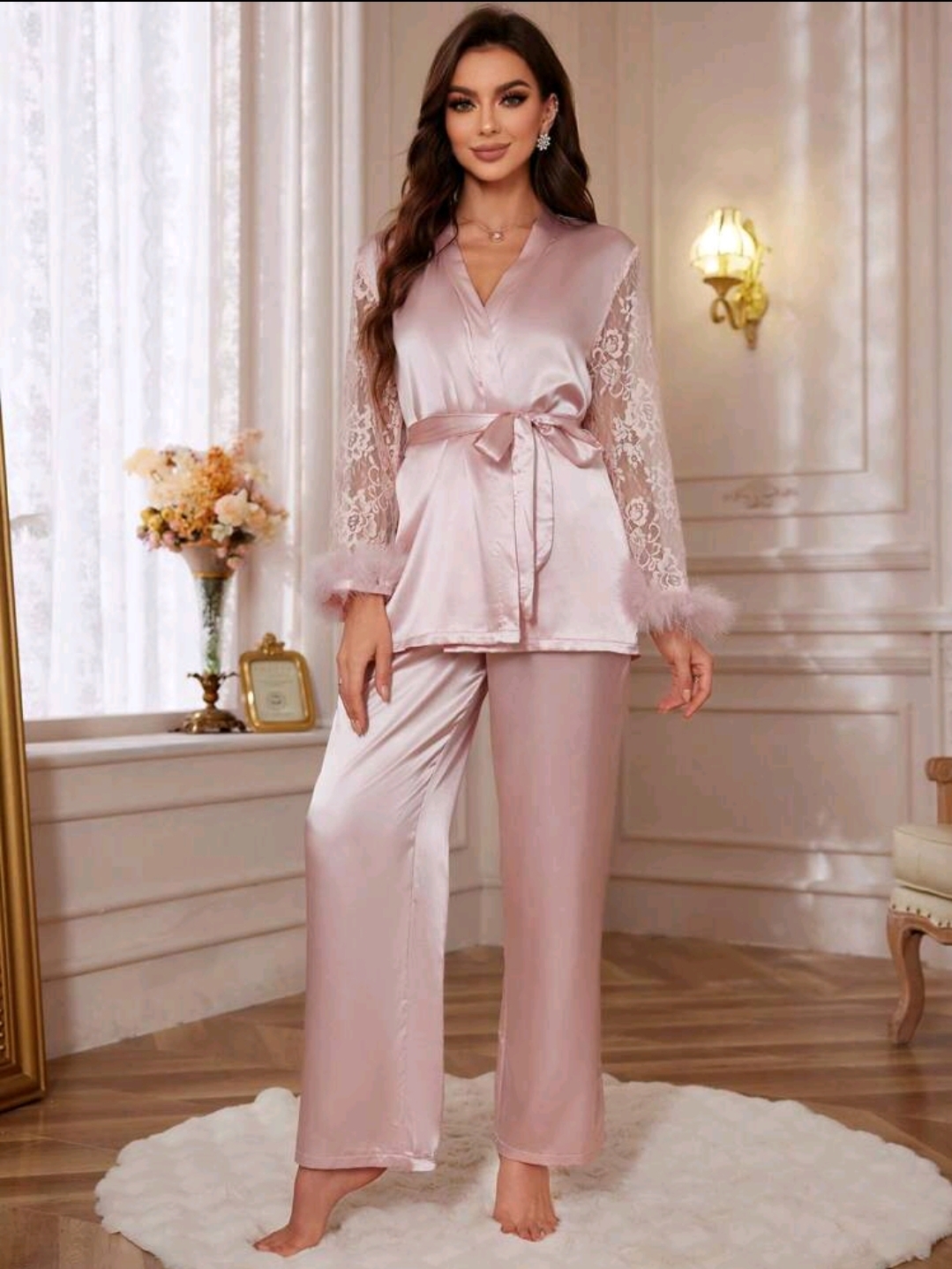 طقم بيجامات نسائي من تريندز بأكمام من الدانتيل المرقعة
