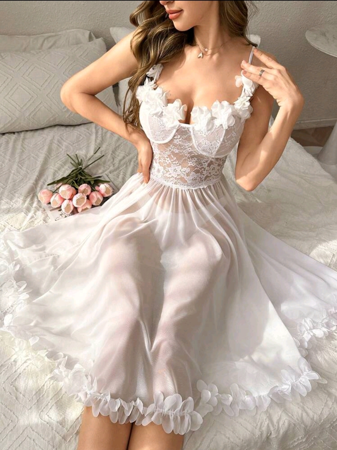 ثوب نوم ماكسي شبكي شفاف مزين بنقشة زهور ثلاثية الأبعاد